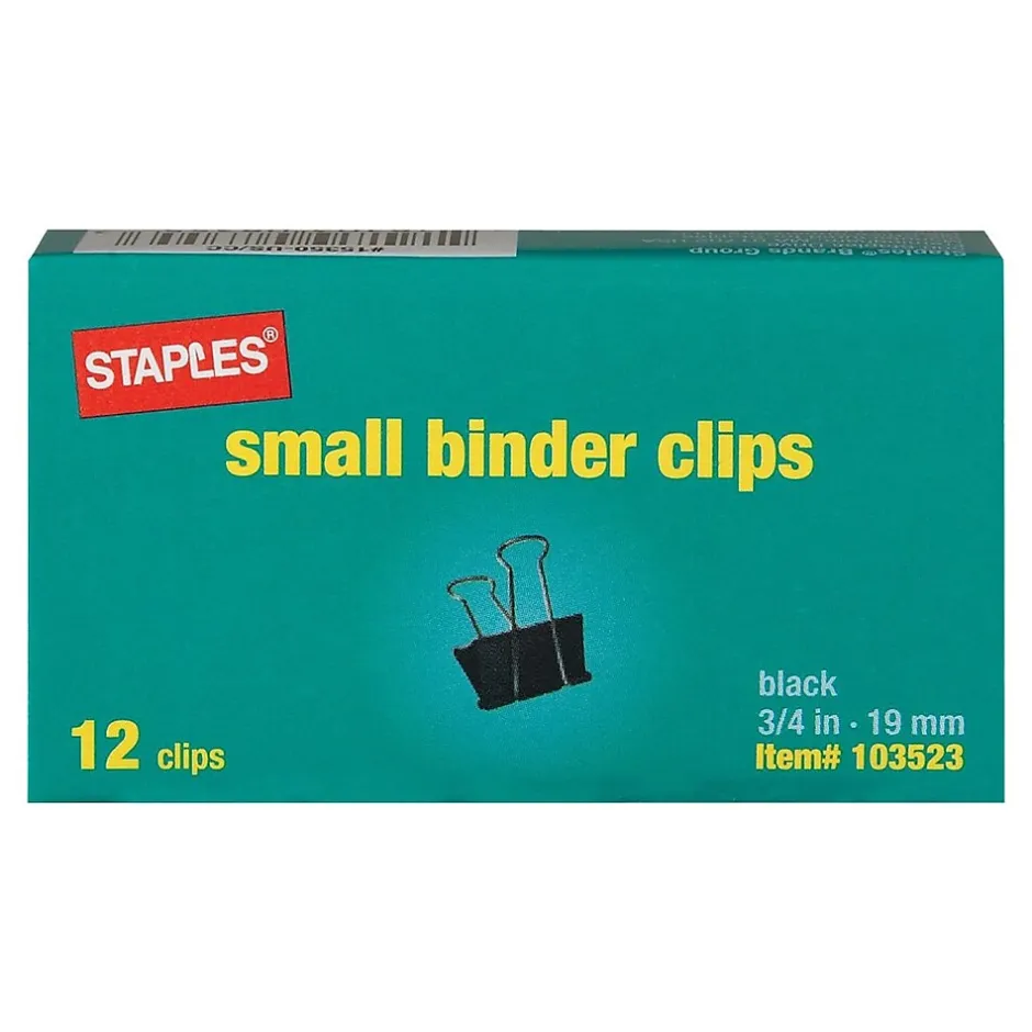 Contain forms and documents with these Staples small binder clips. Each clip includes convenient handles that flip up for hanging, while the durable material offers a sturdy grip, so you can keep loose paperwork organized and neatly held together. These Staples small binder clips come in a pack of 12, making it easy to always have one on hand.