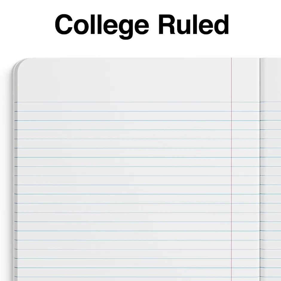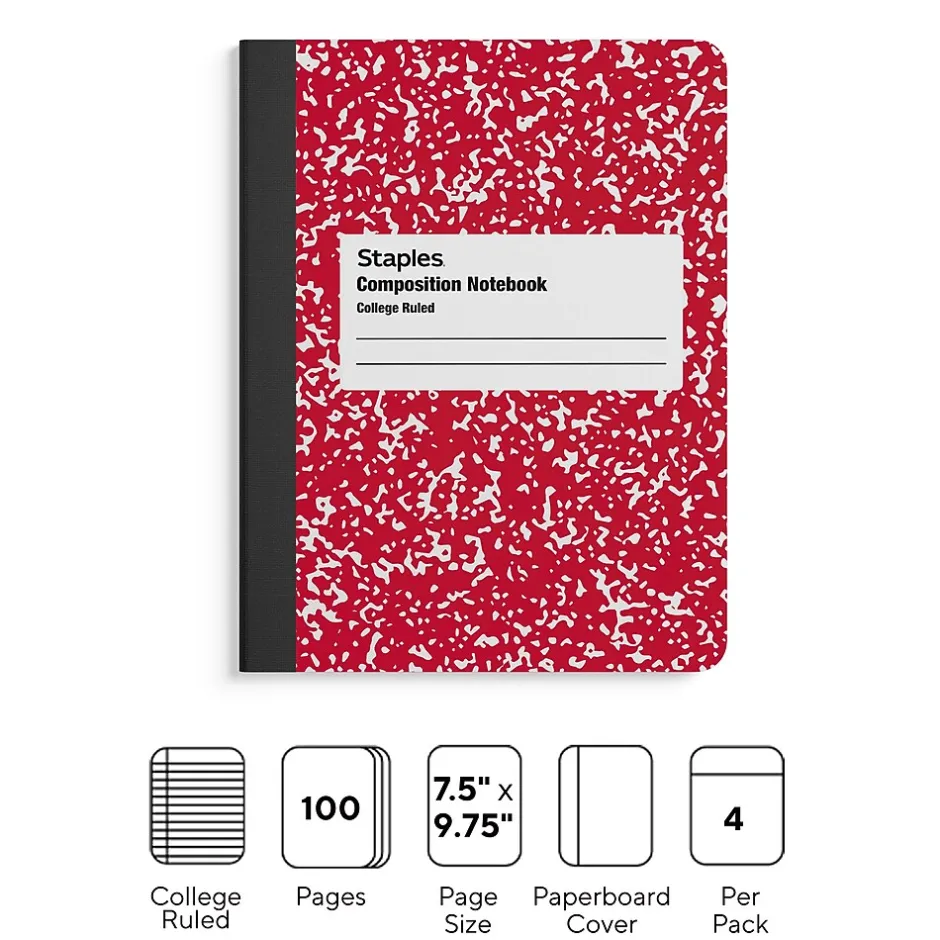 Stock up on writing paper with these 100-sheet composition books. The college ruling makes for efficient use of space and accommodates more lines of text, while the left-side wire-free binding offers easy access to information and lets you skim the pages quickly. These Staples 7.5 x 9.75-inch college-ruled marble composition books have covers in assorted colors for hassle-free organization and identification.