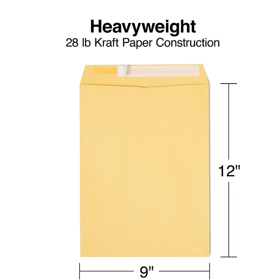 Seal contents safely within these kraft brown catalog envelopes. These envelopes are constructed with 28-pound kraft paper to help prevent damage from puncturing and ripping, and they come in a 250-pack, making them an ideal pick for large mailing tasks. These Staples 9 x 12-inch catalog envelopes have an EasyClose feature that lets you seal them without water.
