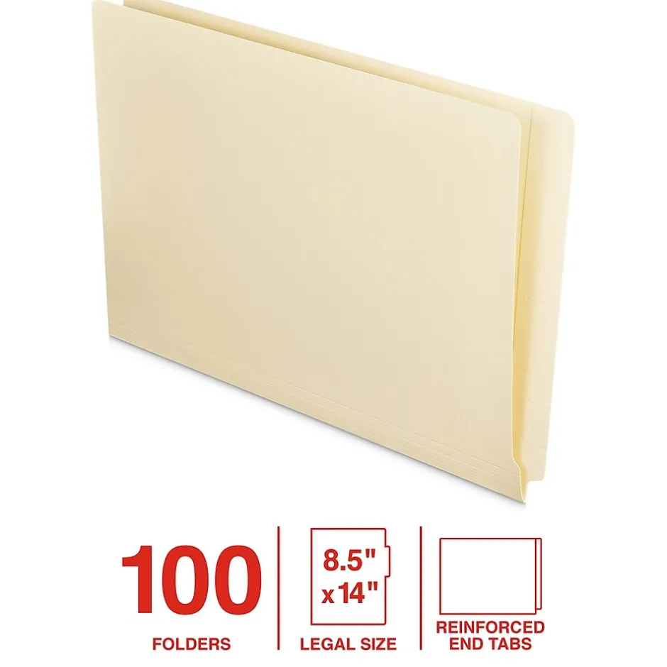 Our premium end tab file folders will give you everything you need to organize and declutter your workspace. These folders are made for legal-size documents and crafted from durable material for long-lasting use. Each folder has embossed lines for easier labeling so you’ll be able to quickly identify your files. The reinforced tabs add a little extra strength and durability, so these folders can be used and re-used frequently. You’ll get 100 folders in each pack, so there will be plenty of help to tackle all your projects or filing tasks. Made from standard-duty 11 pt stock and packaged in an eco-friendly chipboard box with a color label, they’re a great choice for your home or office organization needs.