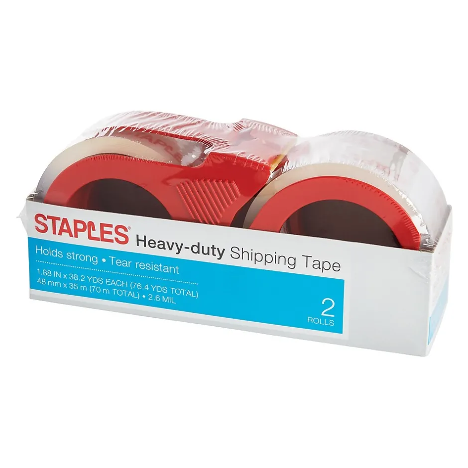 Staples® 2.6 mil Heavy-duty shipping tape measuring 1.88″ x 21.8 yds. is designed for sealing per bundling boxes and has splitting per tearing resistance.