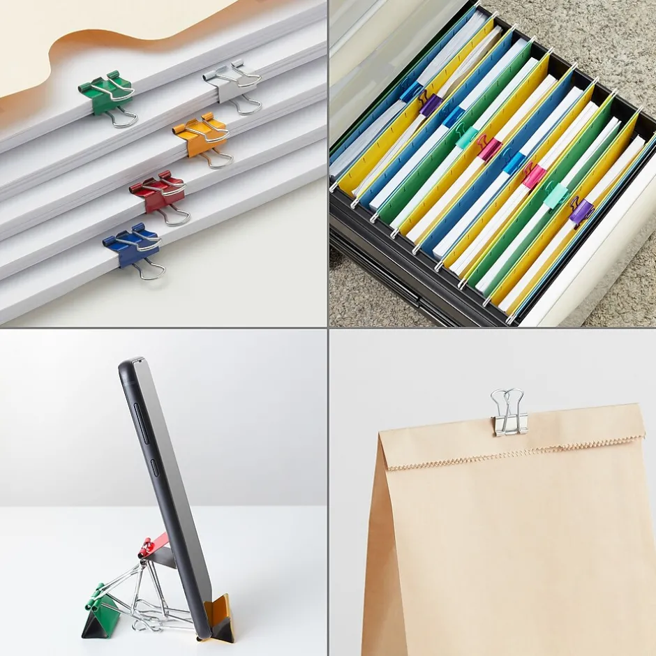 Keep documents securely together with these Staples mini colored binder clips. Each binder clip has nickel-plated handles and an assorted-color clip that can hold up to a 0.25-inch stack of papers, while the tight spring ensures that papers stay securely together. These Staples mini colored binder clips come in a reusable plastic bin that doubles as a long-term storage container.