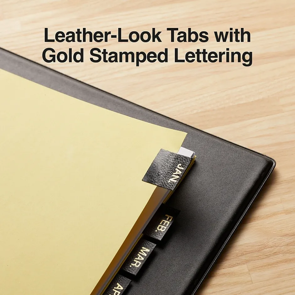 Organize your entire year with this Staples leather monthly tab dividers set. These dividers provide a single-sided support to protect the three binder holes for long-term use. With leather tabs stamped in gold letters on both sides, these dividers are easy to read in both directions and deliver a professional look. This Staples leather monthly tab dividers set contains a minimum of 20 percent recycled postconsumer content to reduce impact on the environment.