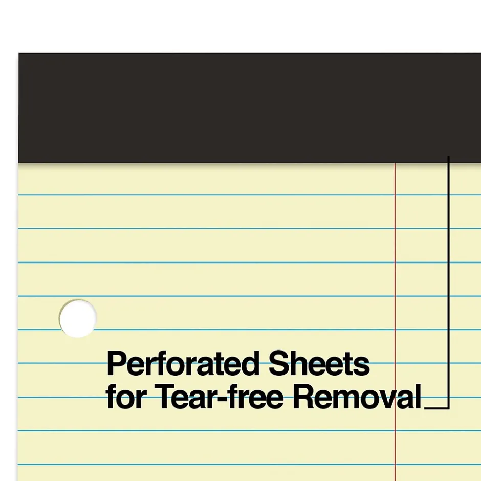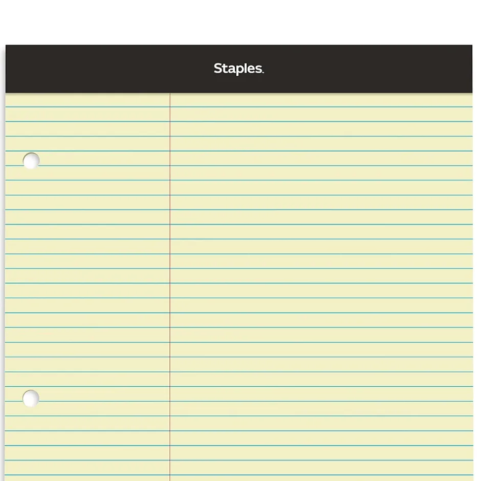 Furnish your work desk with this canary 100-sheet law ruled notepad. Convenient perforations let you cleanly peel off a page, while the law-ruled pages let you easily include notations and points of order in the wide margins. This Staples 8.5 x 11.75-inch canary law ruled notepad features top binding so you can flip through the pages and find information quickly.