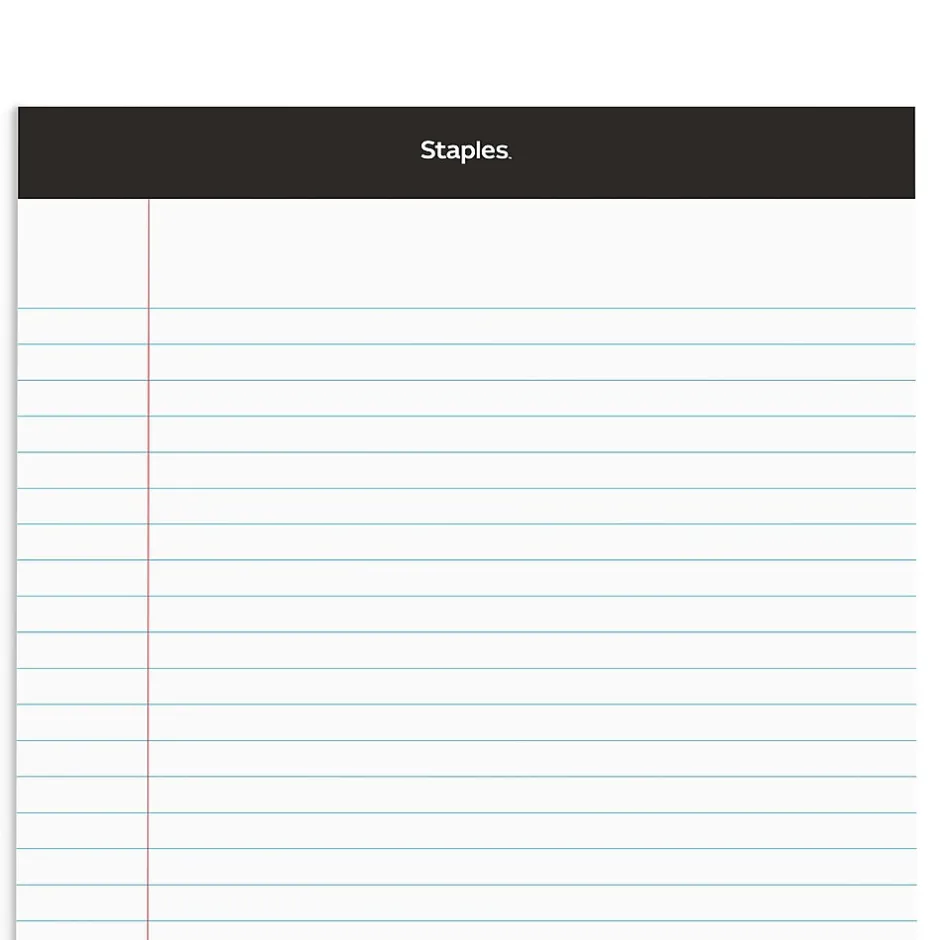 Meet your team’s everyday writing requirements with these 50-sheet ruled notepads. The white pages provide a clean background for your text and drawings, while the wide ruling helps keep your writing neat and easy to read. Convenient micro-perforations let you tear off a page cleanly. These Staples 8.5 x 11.75-inch white wide ruled notepads have a top binding to keep pages secure.