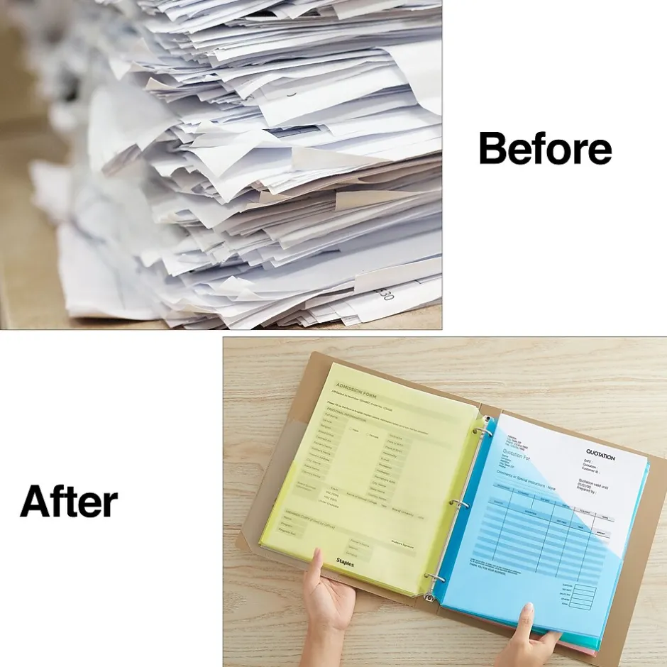 Separate different sections of presentations into easily identifiable segments with these binder pockets. Each pocket fits up to 70 sheets of paper, making these dividers ideal for storing important paperwork that can not be hole punched. Available in assorted colors that make it easy to differentiate the sections of a document, these Staples binder pockets are three-hole punched, allowing them to fit into any standard three-ring binder.