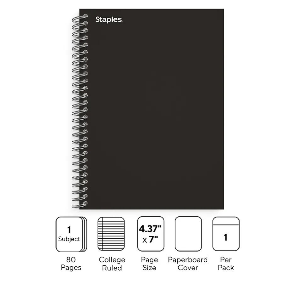 Take meeting and lecture notes with this 80-sheet notebook. The strong twin-wire binding holds up to daily use and allows for flat placement, letting you access information quickly. College-ruled paper accommodates many lines of text for efficient use. This Staples Premium 4.38 x 7-inch black 1-subject notebook features a pocket divider to hold cards and loose documents, and the sturdy cover offers durability.