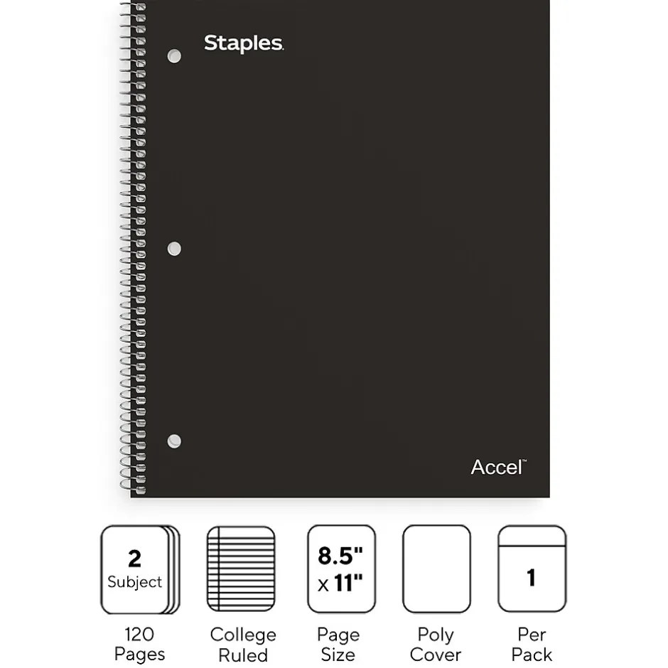 Keep related information together with this 2-subject notebook. The 120 college-ruled sheets let you record lengthy notes, making the most of your space, while the perforated design offers clean page removal. This spiral-bound Staples Premium 8.5 x 11-inch black poly 2-subject notebook lays flat for full page access, and the durable polypropylene cover protects against light spills.