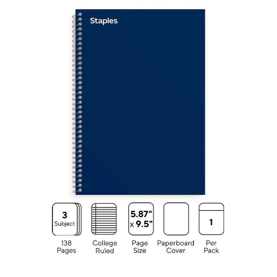 Keep a backup on hand with this 3-subject notebook. The college-ruled design ensures efficient space utilization and neat note-taking, while the twin-wire spiral spine offers easy access to the sheets inside, simplifying usage. Featuring a perforated edge, this Staples Premium 5.88 x 9.5-inch blue 3-subject notebook lets you remove the pages cleanly.