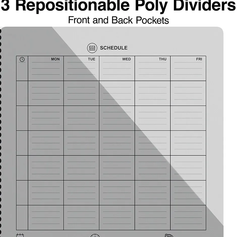 Keep track of project information and progress with this 150-sheet spiral notebook. College-ruled pages help keep writing clean, while the durable spiral binding with Spine Guard protection provides easy access and resists snags. The included repositionable poly pocket dividers offer convenient storage for loose papers. This TRU RED Premium 8.5 x 11-inch blue 3-subject spiral notebook includes page flags to highlight essential information.