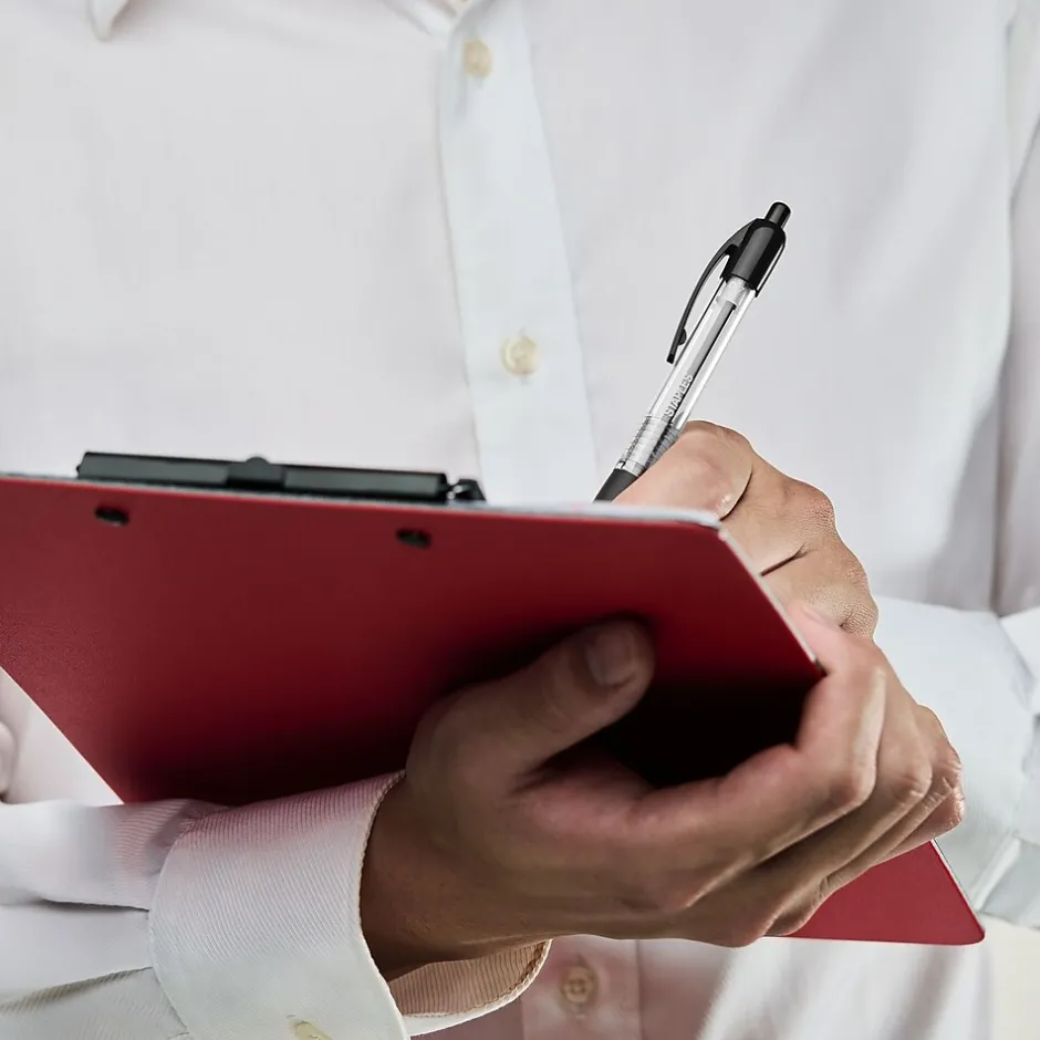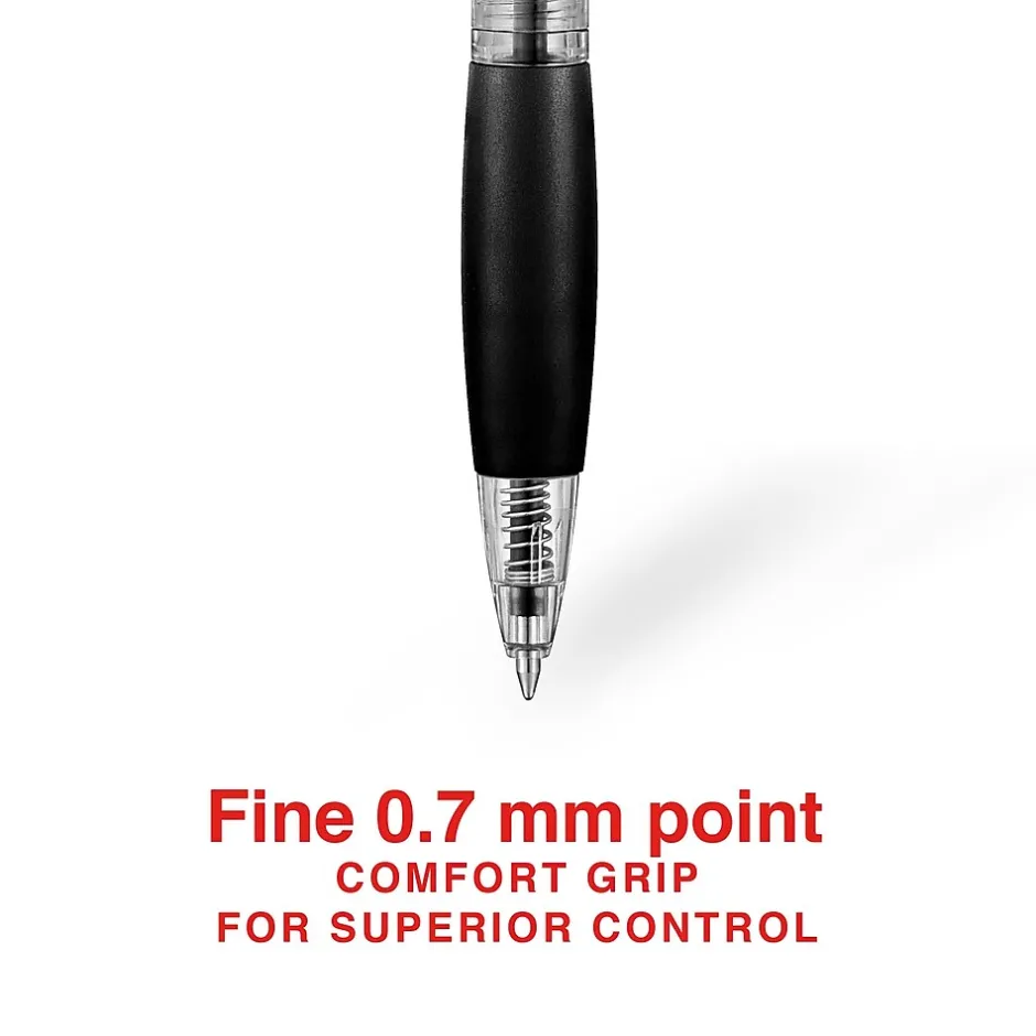 Record information, fill out forms, or take notes with this 12-count pack of retractable pens. The fine points produce precise, consistent handwriting, while the bold black ink is visible through the clear plastic barrel. Rubberized grips on these Staples retractable pens provide control throughout long writing sessions without discomfort, and retractable points prevent accidental ink stains.