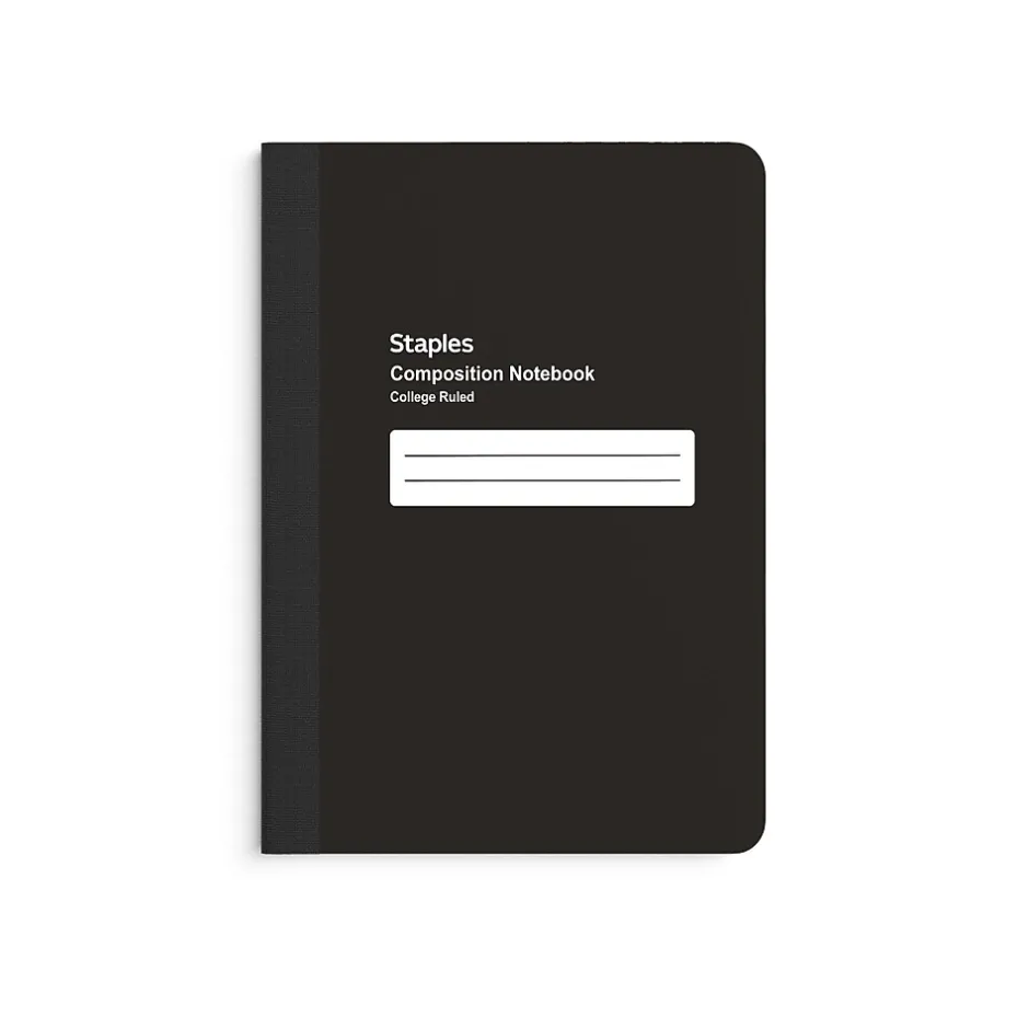 Write notes and lists in this small black poly composition notebook. Conveniently sized to bring on the go, this notebook fits easily into bags, purses or briefcases. The durable poly cover protects your writing, and center stitching keeps sheets tightly bound. This Staples 5 x 7-inch black poly composition notebook contains 80 college-ruled sheets to make the most of your space.