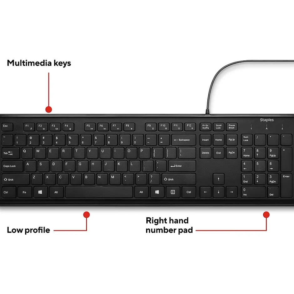 Enjoy effortless typing with the plug and play wired keyboard from Staples TECH. The low-profile keys give you quiet typing and the keyboard has adjustable tilt legs to help you get a comfortable angle. Gain quick access to your most frequent actions with the included function keys. Designed for durability and finished in black so it’s sure to fit in your workspace. This keyboard includes bold key characters, a number lock indicator light, and a numeric keypad for efficient data entry, all backed by a 1 year limited warranty.