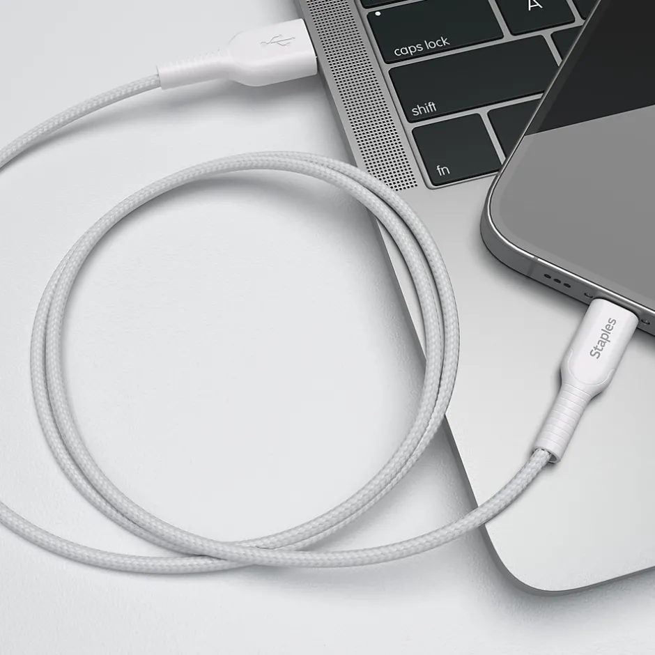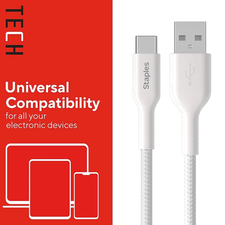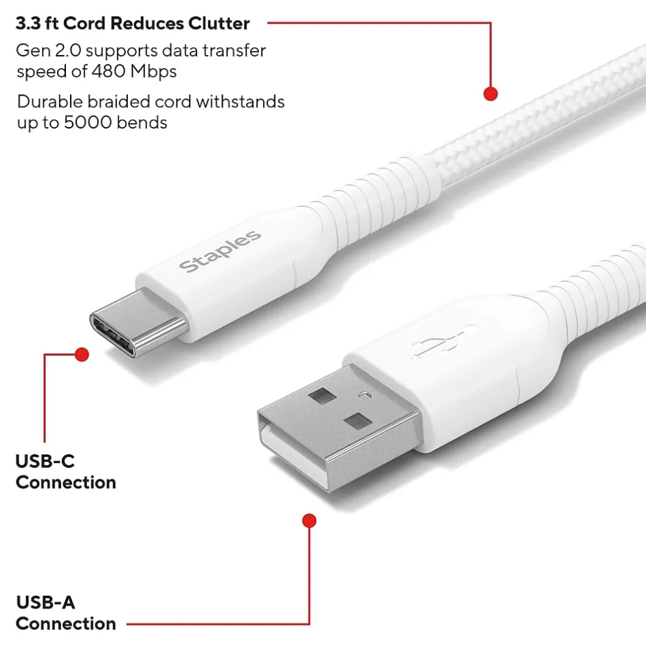 Power your smartphones or tablets with this StaplesĀ® USB-C to USB-A Braided Cable. The unique braided design provides extra durability, prevents tangles and has been tested to withstand up to five-thousand bends. A 3.3ft (1m) cable length is compact enough to prevent messy cords and is easy to take with you on the go.