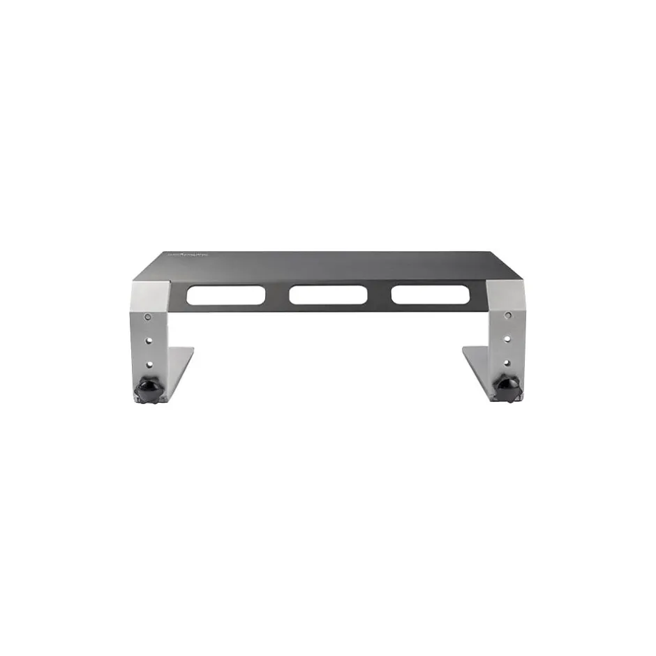 Create a more ergonomic workspace. This strong and sturdy monitor riser stand lifts your display off of your desk for more comfortable viewing, helping to prevent neck strain. Its attractive silver and black design adds to the aesthetic appeal of your workspace, and creates storage space underneath. Elevate your display to position your monitor. You can customize the height of the computer monitor riser, adjusting easily to three different heights: 4.9″, 5.9″ or 6.9″ (12.5, 15 or 17.5 cm) off the desk surface. With a robust 10.5″ x 16″ steel surface area and an aluminum base, the monitor riser provides a stable platform for a monitor up to 32″ with maximum weight capacity of up to 22 lb. (10 kg). You can also use it for your laptop. The non-skid bottom surface of the feet provides a solid grip while protecting your desk surface from scratches and scuff-marks. It’s ideal for a variety of desk surfaces including glass-top desks. Maximize your work space and create a clutter-free area. Store your mouse, phone, and other items underneath the monitor shelf so they are out of view, but not out of reach. You can also use the riser stand to raise your printer, freeing up desk or counter space underneath. The integrated cable management slots keep cables organized and out of view. With fast and easy setup, you’ll be ready to work with the monitor riser within minutes.