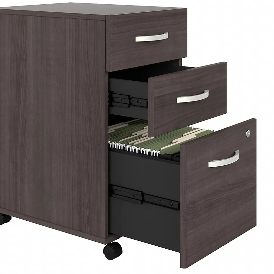 The Bush Business Furniture Studio A three-drawer mobile file cabinet combines a fresh contemporary appearance with the commercial-quality construction needed to withstand years of everyday use. The file drawer opens on smooth full-extension ball bearing slides for an effortless reach to letter-, legal-, and A4-size paperwork, while two box drawers organize writing utensils, notepads, and more. The two bottom drawers can be secured by a single lock to protect sensitive files and personal items. The rolling file cabinet’s compact design allows it to fit underneath a standard-size office desk for a space-saving configuration. This three-drawer file cabinet with wheels has been meticulously tested to meet or exceed the ANSI/BIFMA standards for safety, durability, and performance and is backed by the Bush Business Furniture 10-year manufacturer limited warranty. American-made with US and imported parts.