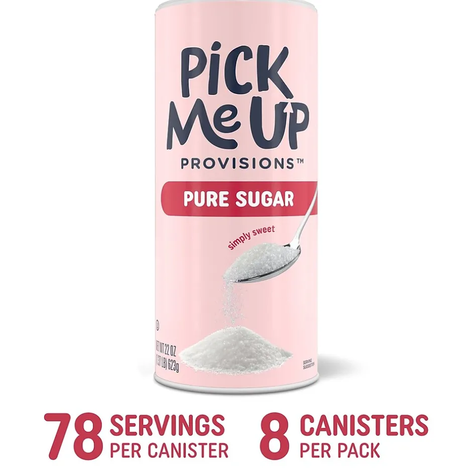 Keep your breakroom buzzing with endless sweetness by stocking it with this 8-pack of 22-ounce Pick Me Up Provisions sugar. You’ll have plenty of sugar to restock the coffee bar, breakroom or waiting room. The easy-to-use flip-top pour spout makes sure you’ll be able to keep providing your office space with 100% pure cane sugar without worry. The canister also keeps out moisture, dust, and other debris so that the sugar is always fresh and ready to be enjoyed. Enhance the flavor of your coffees, teas, and other drinks with this plentiful 8-pack of delicious sweetener.
