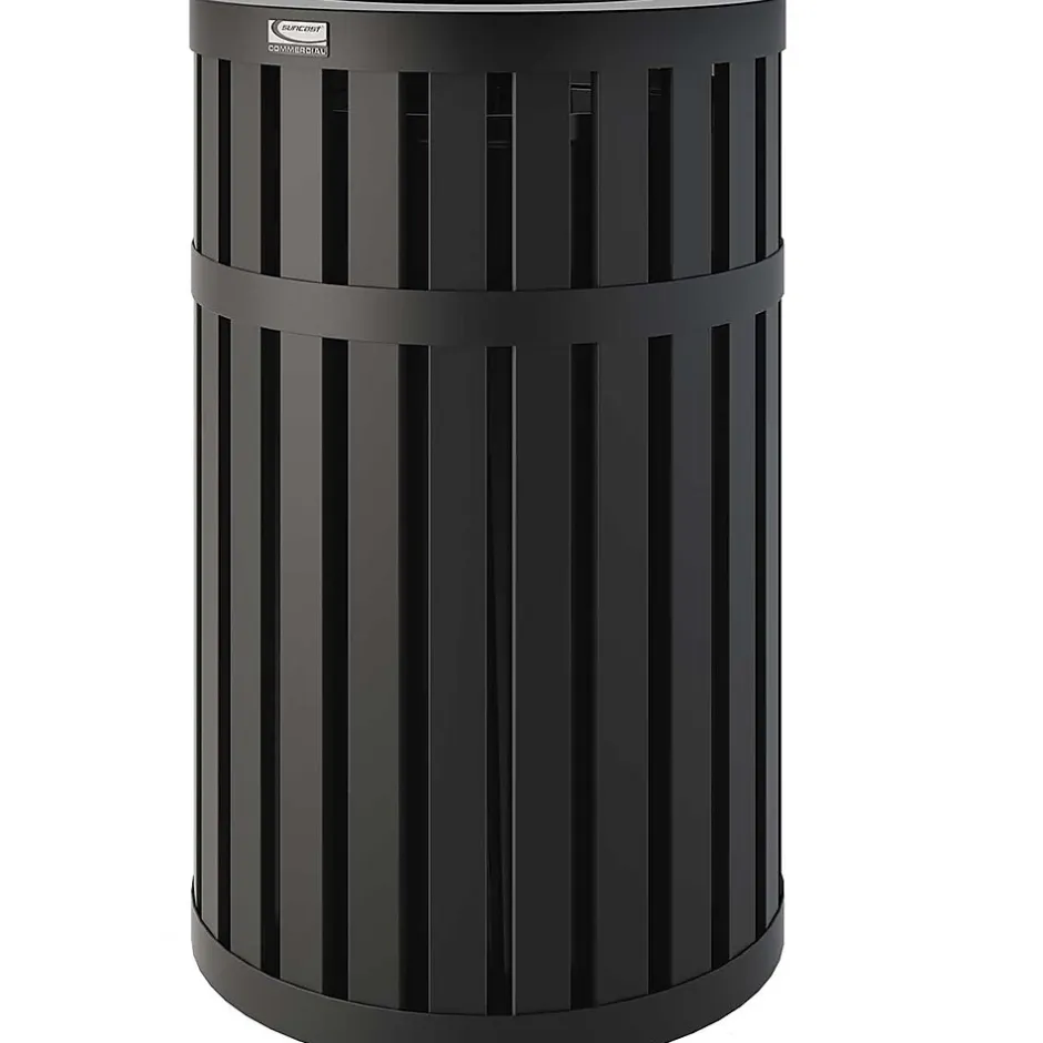 The 45 gallon round slatted metal trash can with canopy lid, is constructed of durable steel. This can comes fully assembled, including a round, high-density polyethylene liner, for easy waste removal. With a slatted design that has a powder coat finish, this can is weather resistant, making it perfect for indoor or outdoor environments.