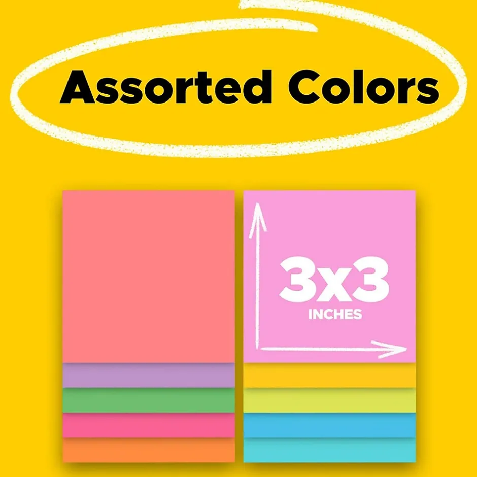 Post-it Super Sticky Notes in 3 in. x 3 in. feature 2x the sticking power. Use for notes or reminders on doors, windows or walls. Unique adhesive reliably sticks and re-sticks so your message can stay front and center. Move your notes with you throughout the day. Energy Boost and Playful Primaries collection colors bring a rainbow of bright colors to use for color coding, or organizing a large project. Post-it Super Sticky Notes are recyclable and the paper in Post-it Super Sticky Notes is sourced from certified, renewable and responsibly managed forests. 15 Pads/Pack, 45 Sheets/Pad.