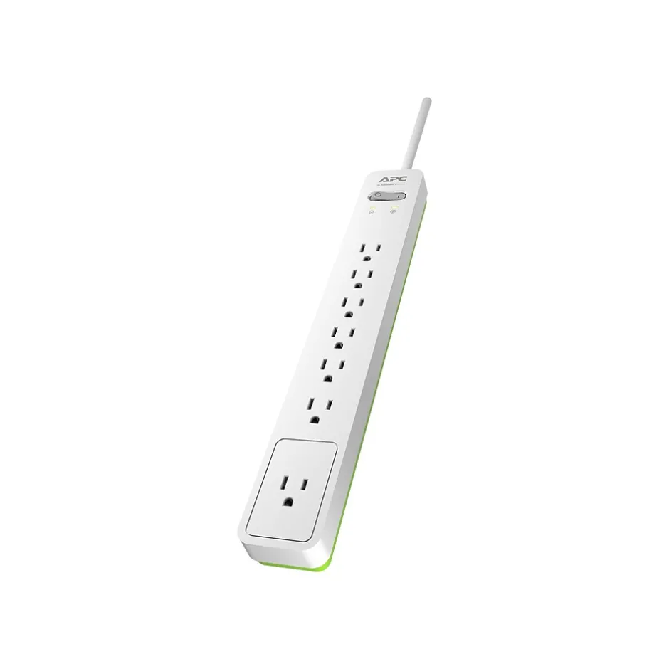 Prevent damage to sensitive electronics with this surge protector. An indicator light provides a warning if circuitry is damaged, and an LED building-wiring fault indicator alerts you to problems in wall circuits. Fail-safe mode automatically disconnects from the power supply if protection is compromised, and the thermal fuse technology reacts instantly to lightning strikes or wiring malfunctions. The plug is angled to the right to accommodate furniture or equipment close to a wall and reduce stress on the 6-foot power cord, while seven outlets let you connect multiple devices and peripheral accessories. This APC surge protector filters EMI and RFI line noise to avoid data loss or lockups in equipment.