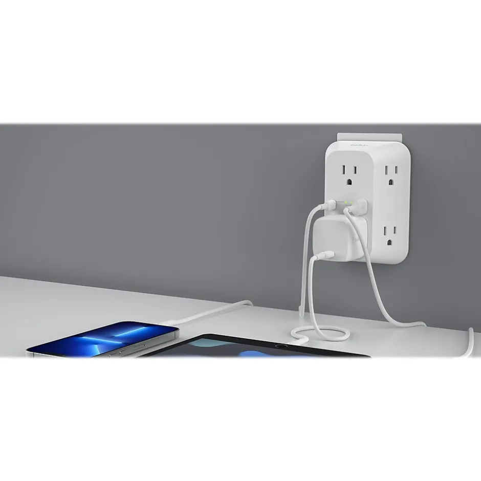 Power up to eight devices with Belkin compact six outlet surge protector with USB-C and USB-A ports. Its smart, space-saving design fits seamlessly with your existing outlet for extra room to charge more devices. It also keeps your laptops, phones, and tablets safe with overvoltage protection.