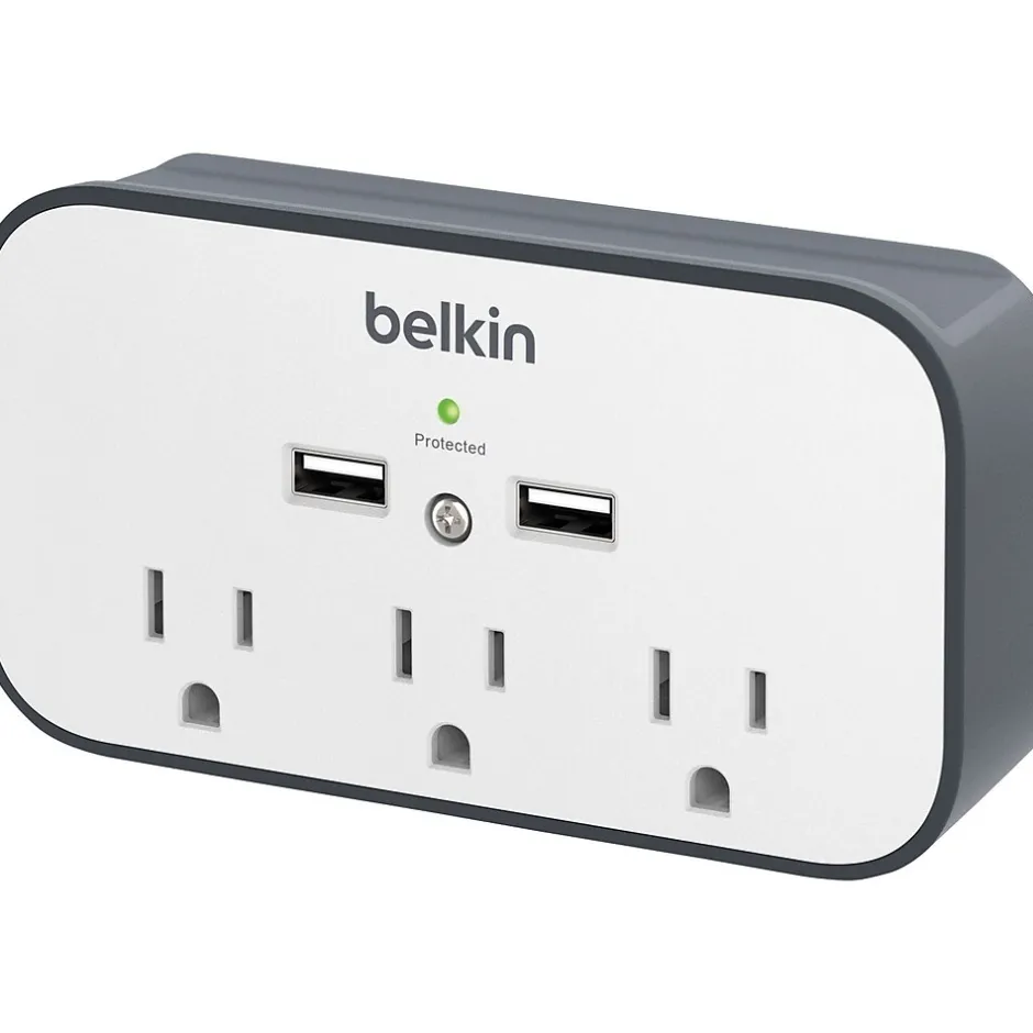Protect three electronic devices or appliances and charge two mobile devices with the Surge Plus USB Wall Mount with Cradle. The surge protector plugs into any A/C outlet in your home or office and even features a ledge to display or store your smartphone or media player.