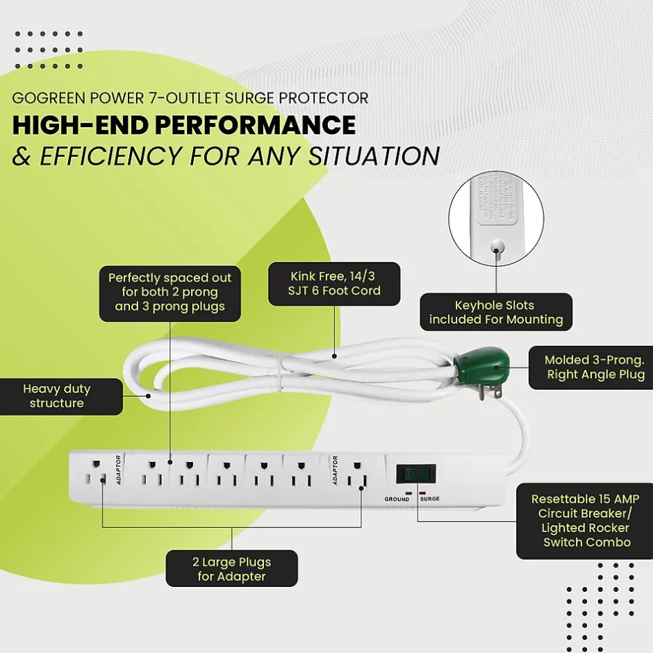 Industry-leading environmental awareness meets top-flight performance in the GoGreen Power® 7-outlet surge protector. Packed with 1,200 joules of protection, a 15 amp circuit breaker, EMI/RFI filters, and an on/off indicator switch, this surge protector offers everything needed to keep the most valuable electronics safe from power spikes, from computers to theater systems.All of our products are made from 100% recyclable material and are eligible for our free customer recycling program at iRecycled.com, proving GoGreen to be a leading lifestyle brand in the consumer electronics space. We are so confident that the premium quality of our products match their eco-conscious design that we offer a lifetime warranty for good measure. Leave your supplier troubles behind and join the recycling revolution today. The planet needs us all to GoGreen together.