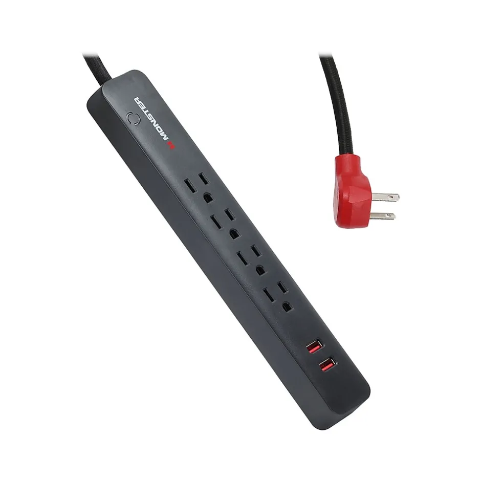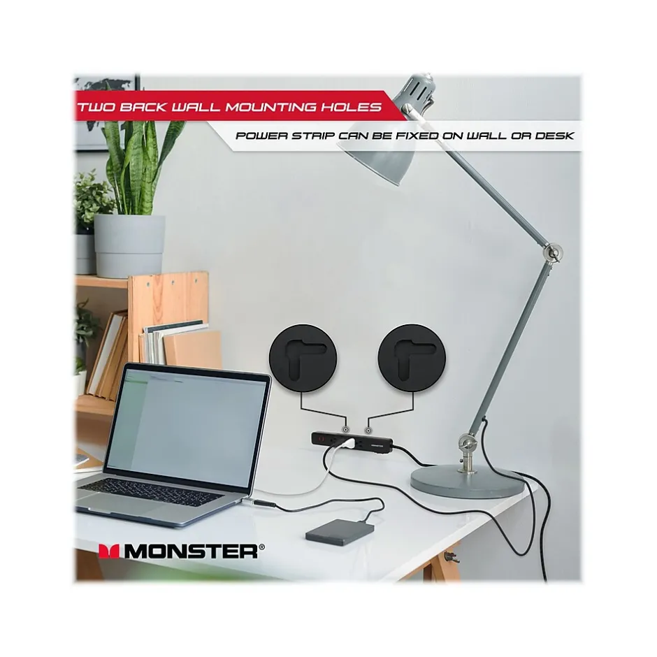 Plug multiple devices without worries with the Monster power strip surge protector that safeguards your electronics and office equipment from permanent damage due to power surges caused by storms or outages. This power strip provides protection for four plug-in devices with up to 600 joule energy rating for maximum performance. Featuring USB charging, this surge protector safeguards not only your AV equipment, but powers and protects mobile devices, like a smartphone or tablet. Also, this power strip can be fixed on desk or wall with two back wall-mounting holes. Monster surge protector provides reliable safety when you need it.