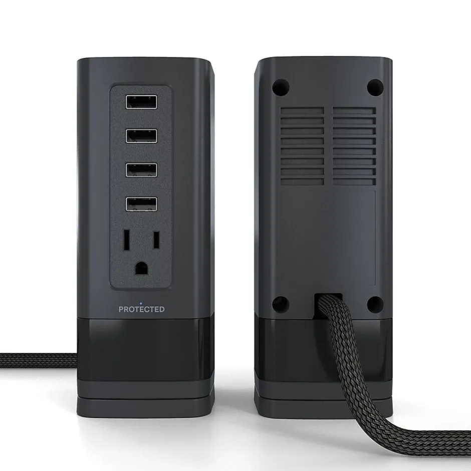 Power up mulitple device simultaneously and safely with this one-outlet four-USB surge protection tower. The protected light indicator lets you know that surge protection is enabled on your device during charging, while the braided cord ensures long-lasting use. The flat right-angled plug easily fits behind tight and hard-to-reach spaces. This convenient NXT Technologies™ one-outlet four-USB surge protection tower lets you set up a single charging station that keeps your cords and wires organized.