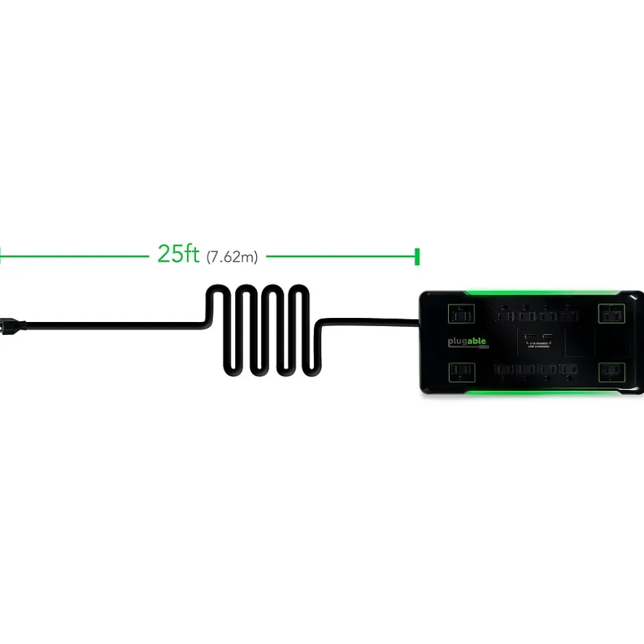 The Plugable PS12-USB25 12-outlet power strip in black, has two USB ports for charging and 12 standard US 3-prong grounded power outlets with sliding covers. Strip that uses 120 VAC/60 Hz input, has 15 A, 1800 W capacity and provides 4320 J of protection. It has 2-in-1 power/circuit breaker switch and built-in EMI/RFI filter for extra protection. The strip with 25′ power cable is compatible with Acer Iconia W4, Amazon Kindle 4/Kindle Fire/Kindle Fire HD 8.9/Kindle Paperwhite, Apple iPad 1/4 Retina/iPad Air/iPad Air 2, Apple iPhone 4/5/5s/6, ASUS T100TA, Dell Venue 11 Pro 7130/8 Pro 5830, Lenovo Miix 2 8, Motorola Droid/Droid 2/Droid X/Moto X Gen 1/Moto X Gen 2 and Nextbook Nextbook8 Windows 8.1.