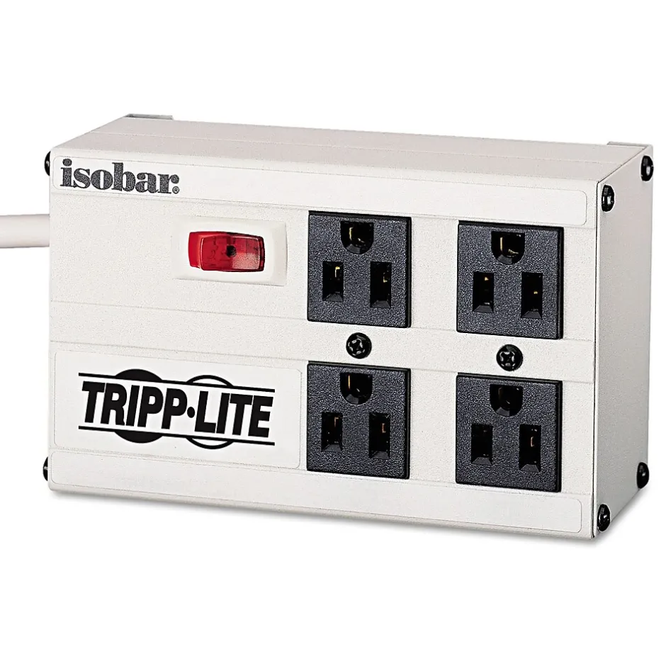 Tripp Lite 4 Outlets 3330 J isobar surge suppressor in light gray/black color is used to protect computer, networking, telecom equipment from spikes and has a cord length of 6′.