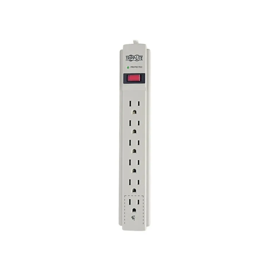 Keep electrical equipment and devices insulated from power fluctuation with this surge suppressor. A 15-foot power cord is ideal for large rooms and provides flexibility to organize equipment or workstations, and keyhole slots in the bottom panel allow mounting on a desk or wall. Interference from EMI and RFI line noise is filtered to preserve data and prevent hardware damage. Six outlets provide space for devices, accessories and a transformer, while an automatic shutoff stops power flow permanently if the protection circuit is impaired. The lighted switch on this Tripp Lite surge suppressor lets you control power flow with one touch, and the diagnostic LED clearly shows that protection is active.