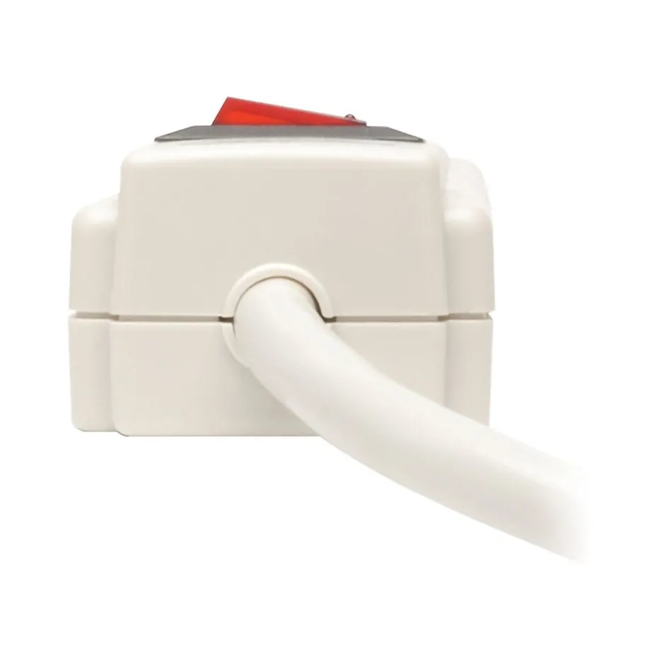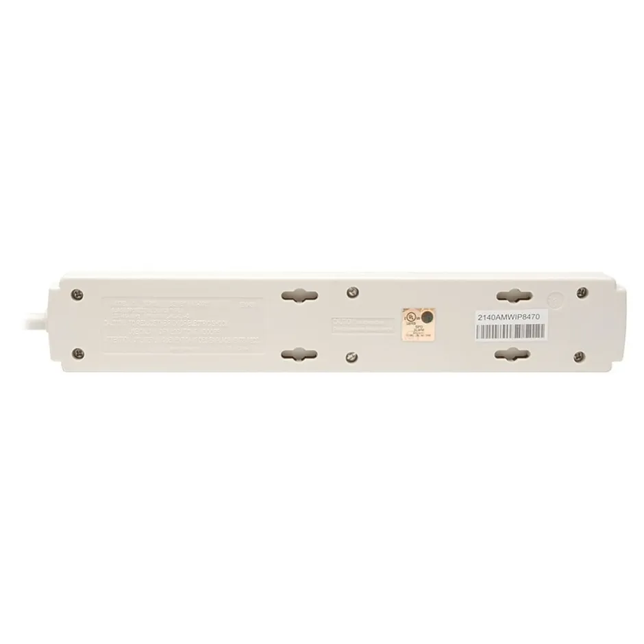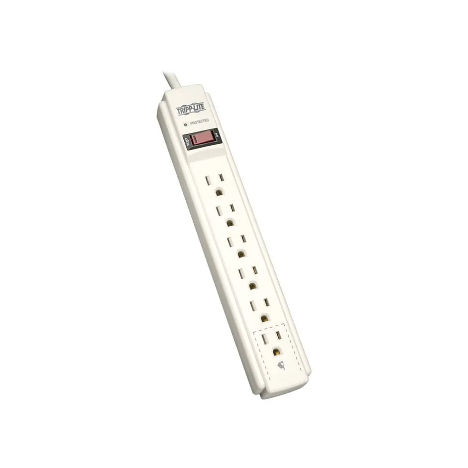 Protect sensitive electronics in the workplace or home with this gray surge protector. Six outlets provide space for multiple devices and one transformer, while a 15-amp resettable circuit breaker cuts power flow if the protective circuit is compromised. The 4-foot power cord allows flexibility to organize workstations, and a lit switch turns power on and off for all devices at once. Surge suppression includes full normal and common mode, while interference from EMI and FRI line noise is filtered to prevent data loss or hardware damage. The diagnostic green LED of this Protect It! Tripp Lite surge protector clearly indicates protection is active, and keyhole slots in the bottom panel enable mounting on a wall or desk.