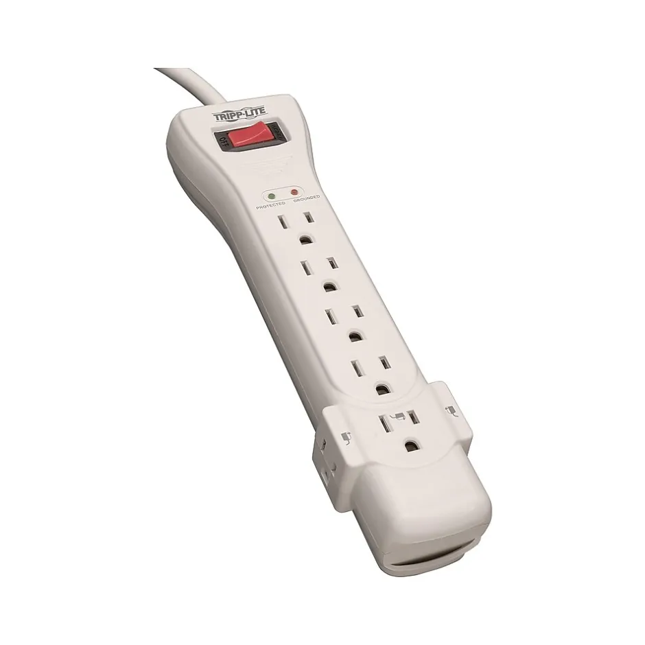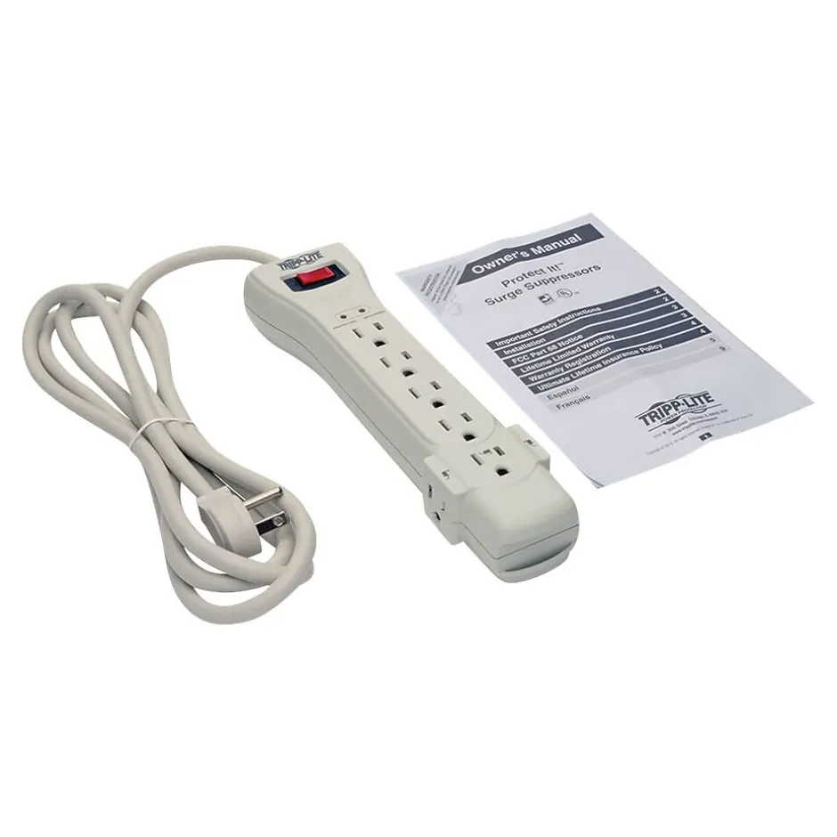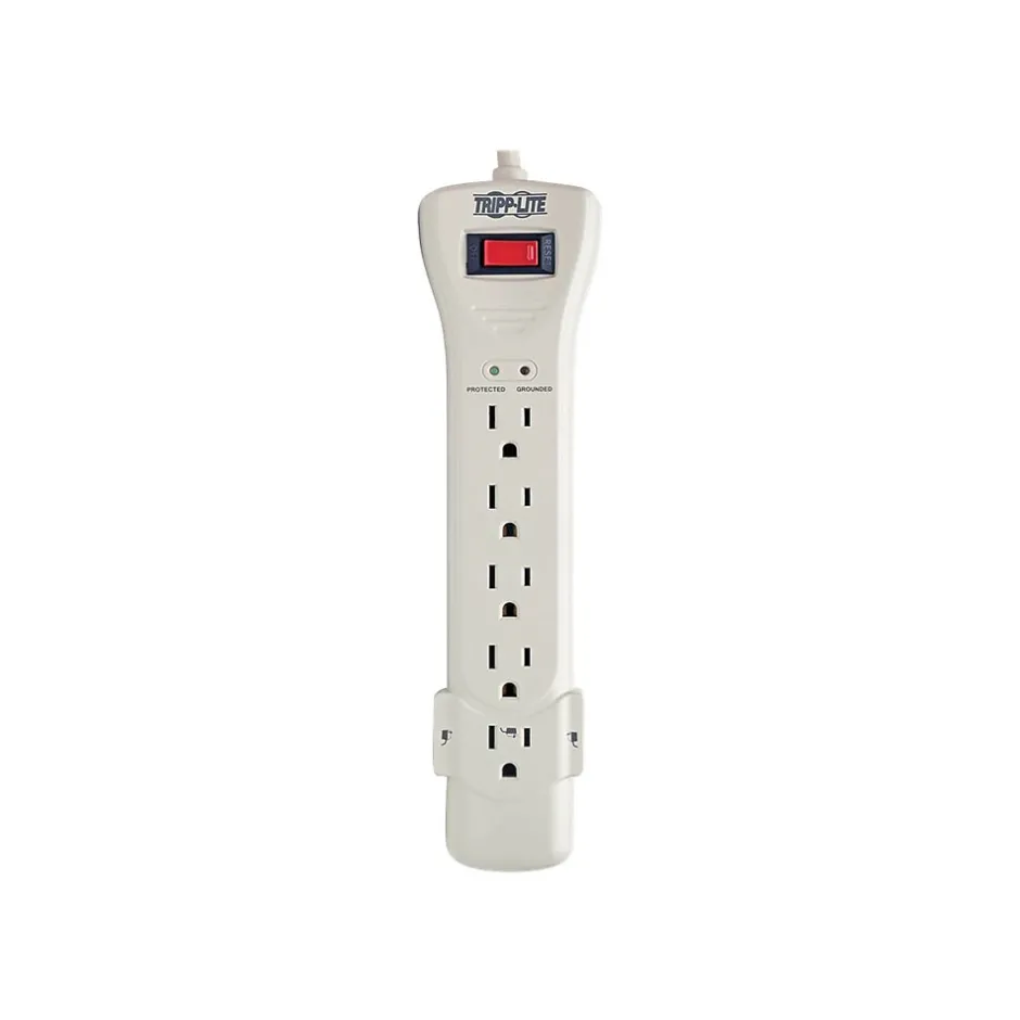 Shield electronic devices or equipment from power spikes with this light gray surge protector. Two outlets are positioned on the side to accommodate three transformers without blocking the five surface outlets, while the power switch controls every connected device simultaneously. A diagnostic LED indicates active grounding status, while the 15-amp circuit automatically shuts down if protection is impaired. The 7-foot power cord allows flexible placement of equipment or workstations, and keyhole slots in the plastic housing enable mounting on a wall or desk. This Tripp Lite Protect It! surge protector suppresses excess electric current up to 2160 joules, while EMI and RFI interference is filtered to avoid data loss or damaged hardware.