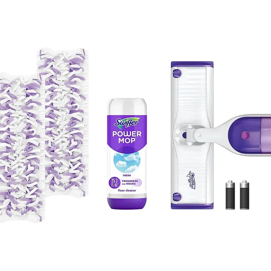 Mop smarter with the Swiffer PowerMop, an all-in-one mopping system that gives you a mop and bucket clean in half the time. The multi-surface mopping pads have more than 300 scrubbing strips that reach deep into grooves and grout to remove sticky spills and daily dirt and grime. The fresh scent of the PowerMop solution will fill your home with freshness for hours. Some assembly required; batteries included.