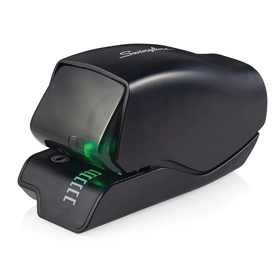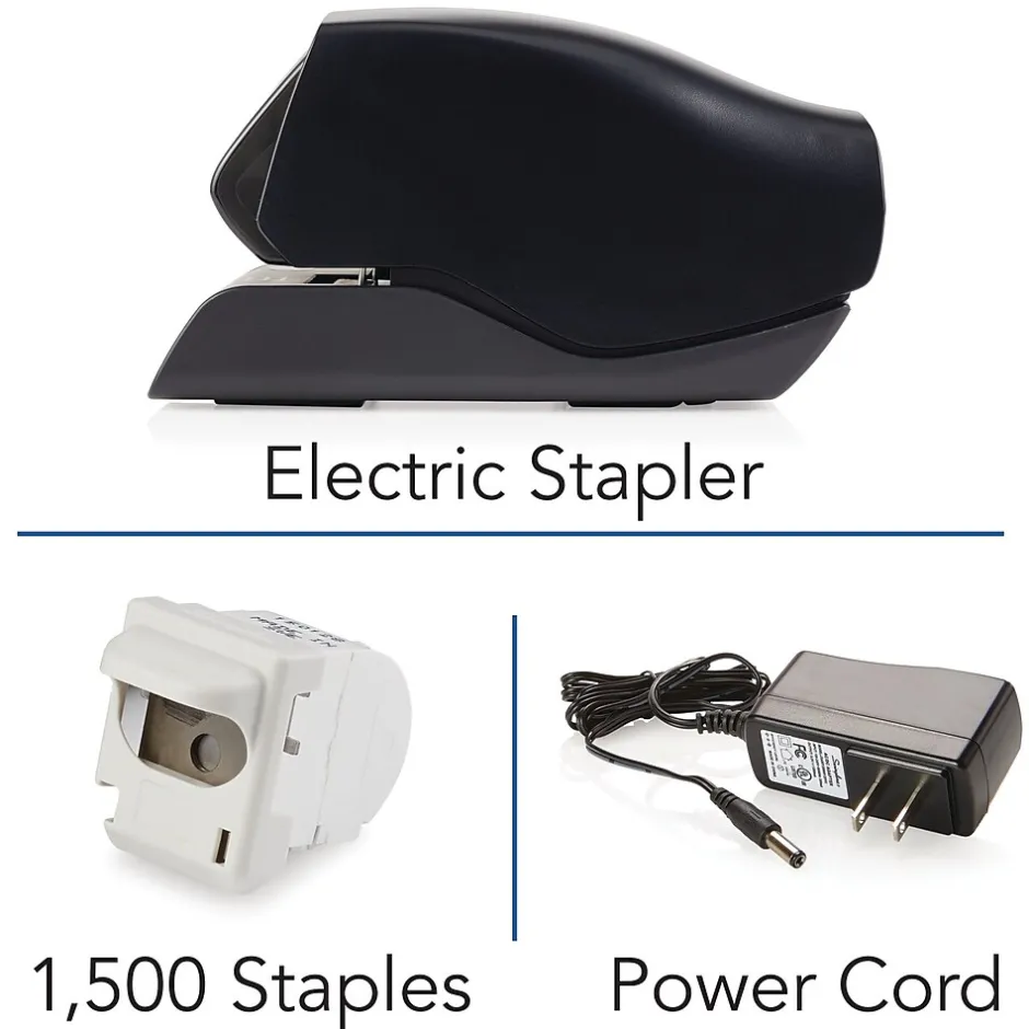 An effortless electric stapler with patented cartridge stapling technology that staples up to 25 sheets. Staple 1,500 times before having to replace the staple cartridge. With Flat clinch, the staples legs are flattened versus rounded (like traditional stapling) so when stapled pages are stacked – they lay flatter.