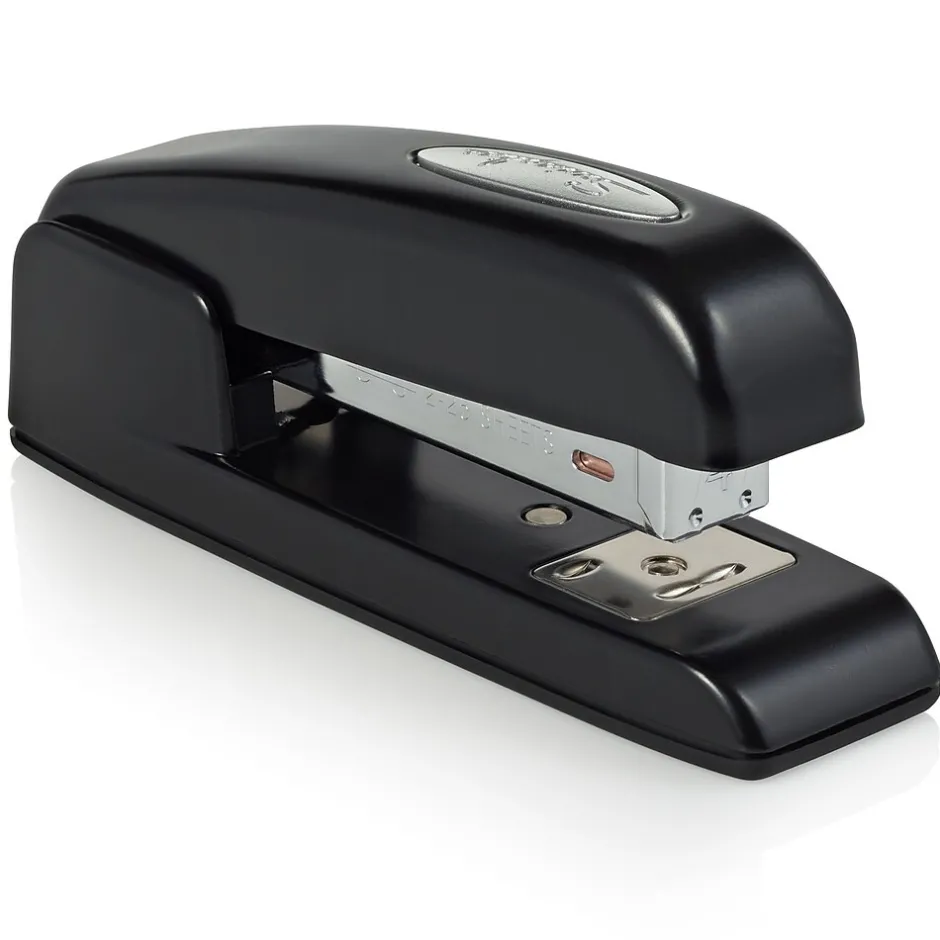 Keep papers organized by using this stapler. The smooth edges fit the hand naturally for comfortable use, and the inner railing helps prevent jamming, allowing for consistent operation. High strength allows up to 25 sheets of paper to be fastened at a time. This Swingline 747 business stapler can be opened for tacking up flyers and posters, and the all-metal die-cast base provides durability for standing up to daily wear.