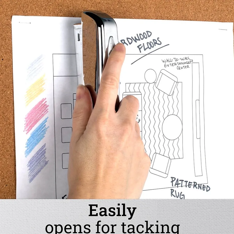 - Stapler opens for tacking ability
