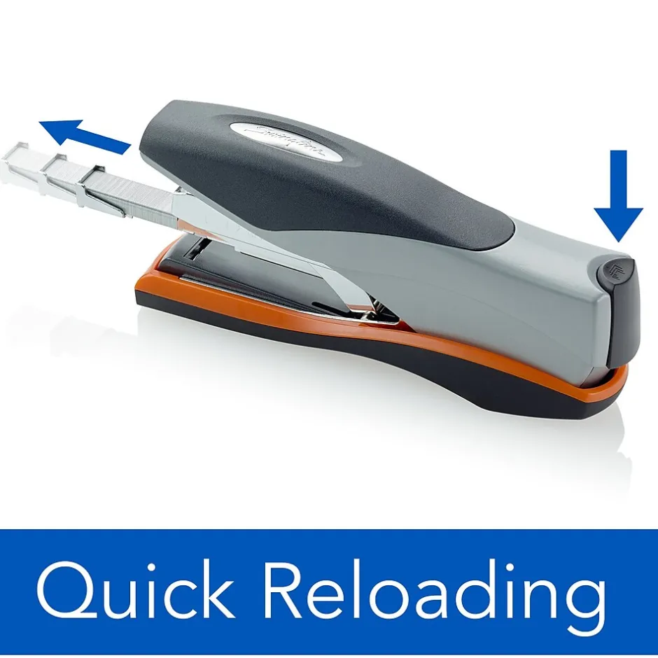 Fill this stapler quickly and easily using the QuickLoad magazine. With a capacity for 210 staples, this stapler lets you create hundreds of packets before refilling. The ergonomic construction provides a comfortable grip, and the reduced-effort design makes operation easy. This Swingline Optima 40 desk stapler produces a staple flat on the back of documents so your bundles are neat.