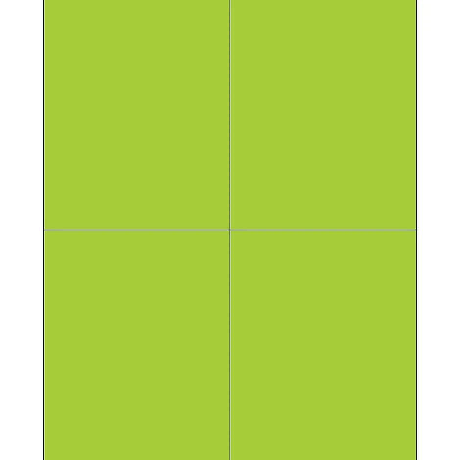 4 1/4″ x 5 1/2″ Fluorescent Green Rectangle Laser Labels. Use to create your own product or mailing labels. Labels work with both Laser and ink jet printers. Permanent adhesive. Labels stick to a variety of smooth surfaces including paper, corrugated, plastic, wood, glass and metal.