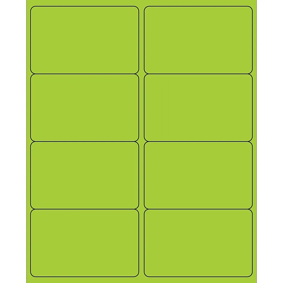 4″ x 2 1/2″ Fluorescent Green Rectangle Laser Labels. Use to create your own product or mailing labels. Labels work with both Laser and ink jet printers. Permanent adhesive. Labels stick to a variety of smooth surfaces including paper, corrugated, plastic, wood, glass and metal.