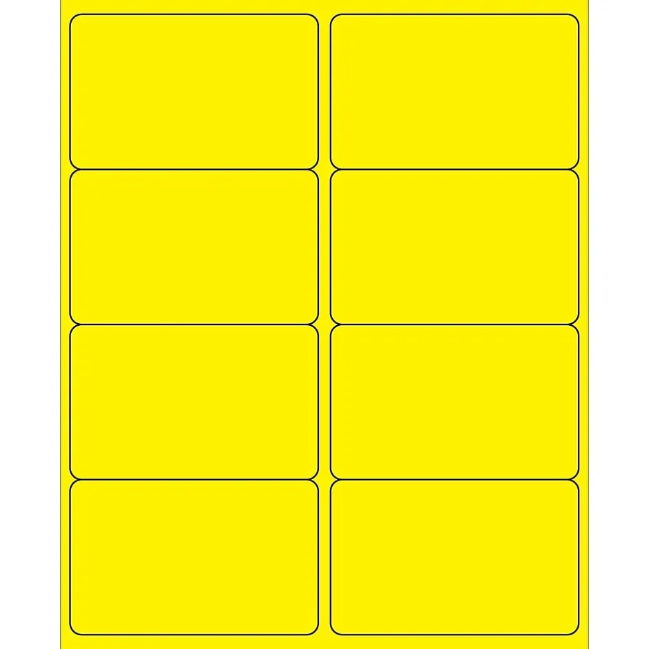 4″ x 2 1/2″ Fluorescent Yellow Rectangle Laser Labels. Use to create your own product or mailing labels. Labels work with both Laser and ink jet printers. Permanent adhesive. Labels stick to a variety of smooth surfaces including paper, corrugated, plastic, wood, glass and metal.