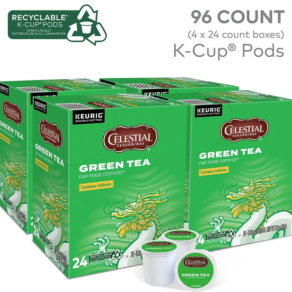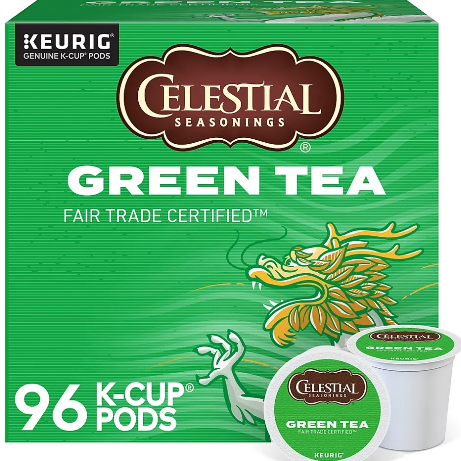 Keep your kitchen, reception area or break room stocked with this 96-count pack of green tea pods. Fair Trade Certified ingredients let you feel good about every cup you pour, while the combination of Bai Mu Dan white tea and green tea delivers a smooth, mild flavor profile. These Celestial Seasonings tea pods work in Keurig brewing machines, making it easy to prepare a single cup whenever you need a soothing hot beverage.