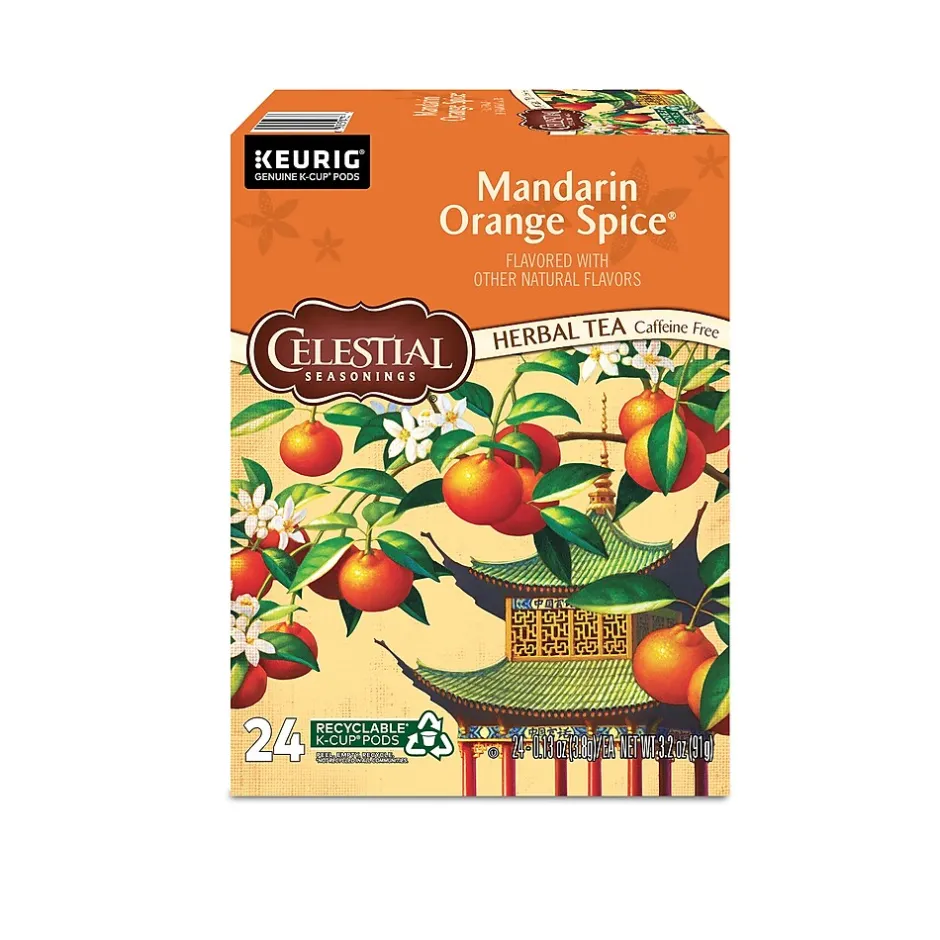 Enjoy an exotic refreshing cup with these mandarin orange spice tea pods. With 24 in a pack, these pods keep office or breakroom supplies stocked, while the delicious orange flavor mixes with piquant cloves for an indulgent, exciting oriental taste. These Keurig K-Cup Celestial Seasonings tea pods are caffeine-free and offer a medley of pleasant aromas to tempt your senses.