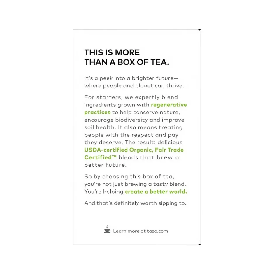 The Tazo Green Ginger regenerative organic tea is a bright green tea with a kick of ginger spice and a burst of sweet pear notes for an unexpected twist.