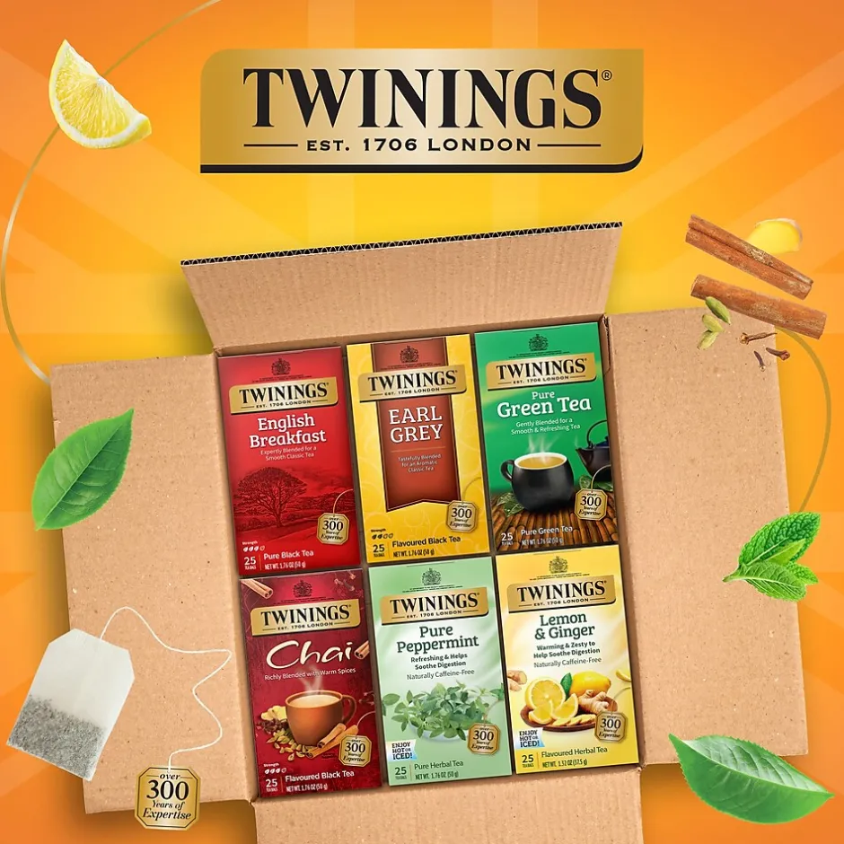 Provide a variety of Twinings® Tea favorites: English Breakfast, Earl Grey, Chai, Green, Peppermint, and Lemon & Ginger.