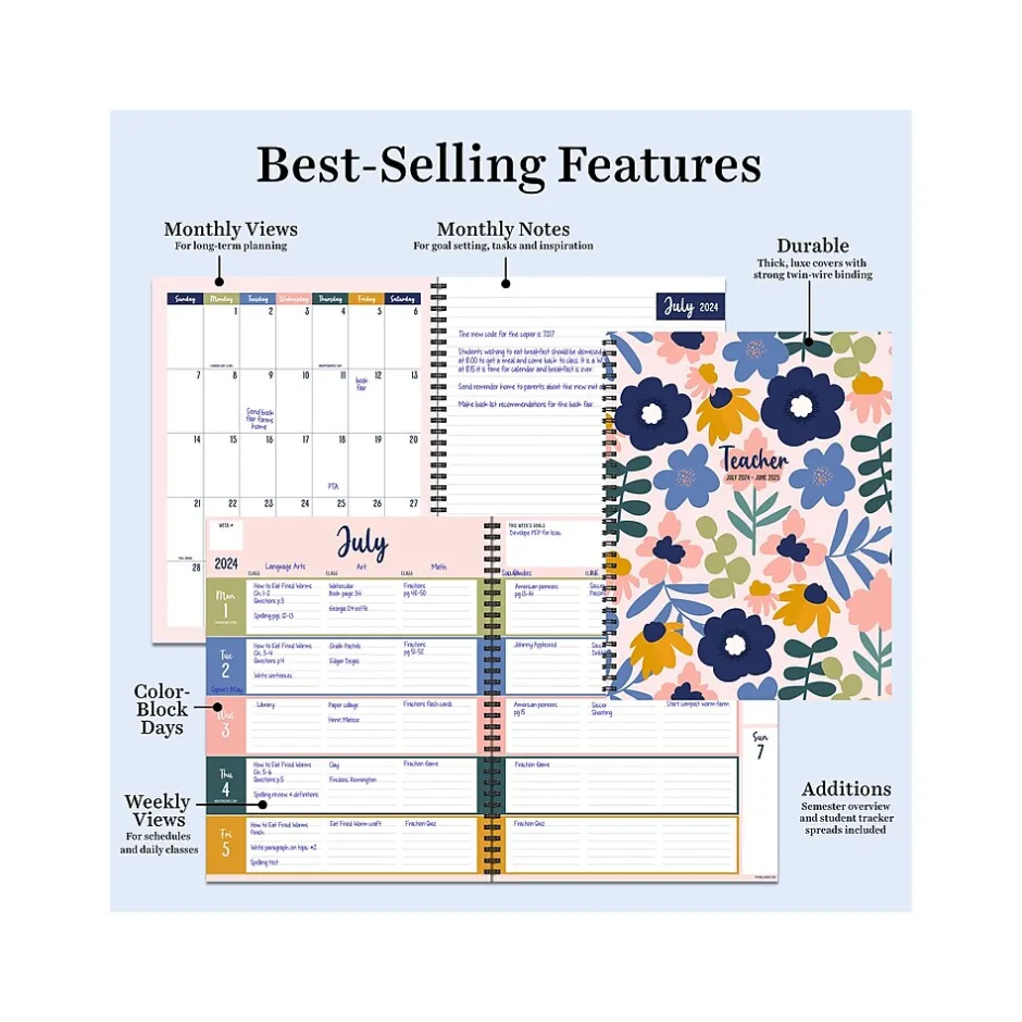 The TF Publishing teacher planner is designed by teachers for teachers, and packs a punch, so you only need one planner for the entire year. The monthly spreads include a monthly overview on the left side and a lined notes page on the right. The weekly pages allow for up to six class overviews to be planned for each school day. Each grid box is the size of a small sticky note.