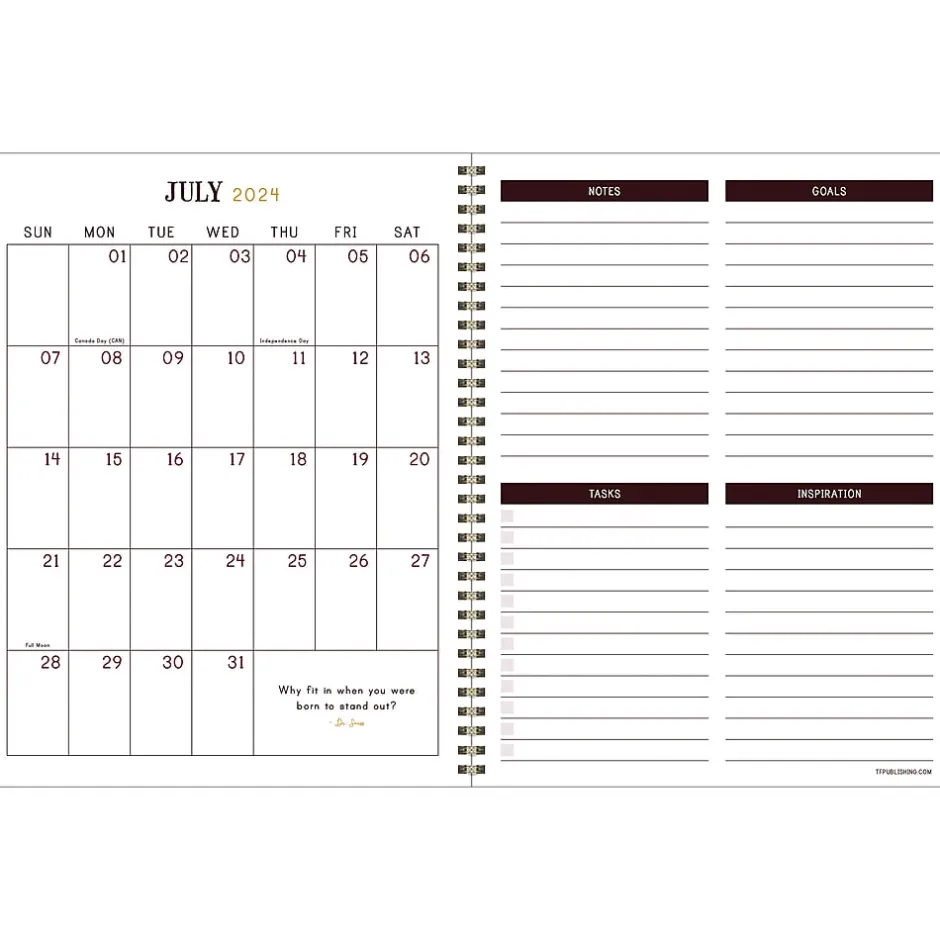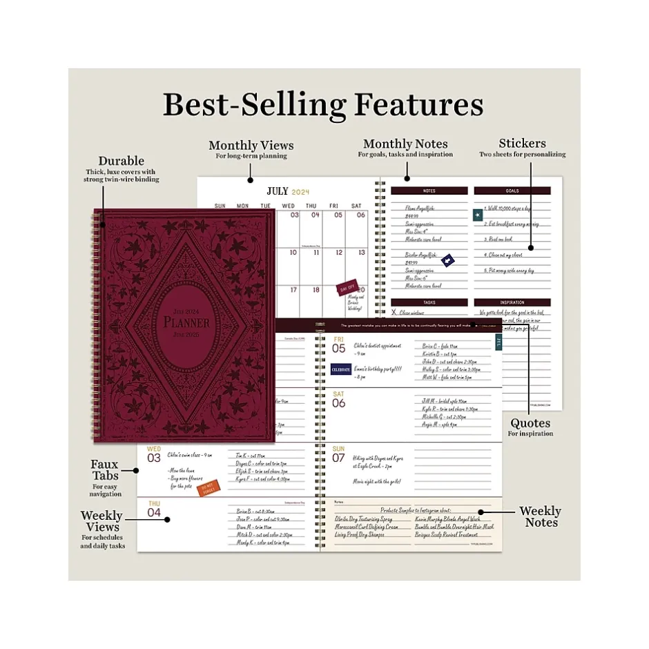 - Weekly spreads for schedules, daily tasks, and priorities; monthly views for long-term planning with sections for monthly goal setting, notes, tasks, and inspiration