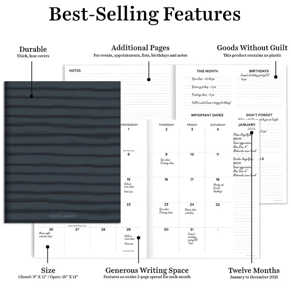 - Additional planning pages for events, appointments, lists, birthdays and notes are included after each month