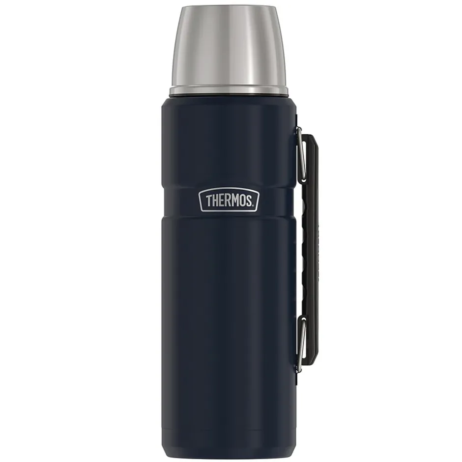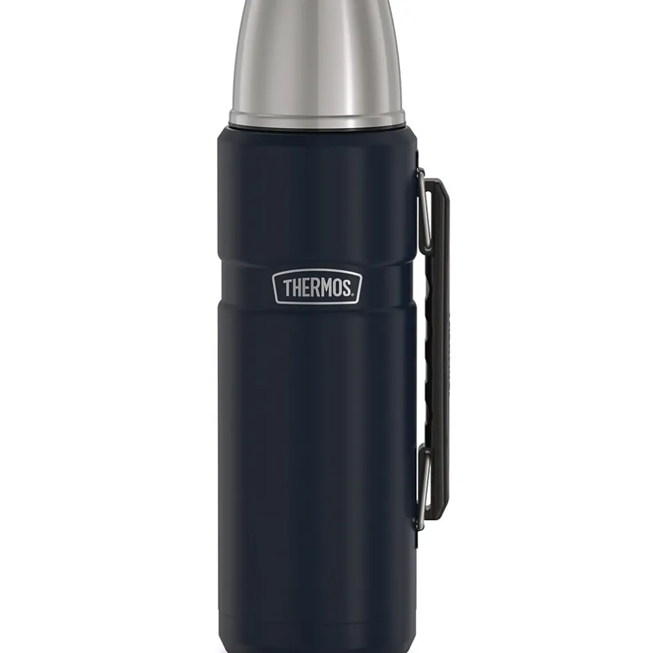 This Thermos 40-Oz. Stainless King Vacuum-Insulated Stainless Steel Beverage Bottle is the perfect take-along for family camping and outdoor enthusiasts. Double wall stainless steel construction and Thermos vacuum-insulation technology keeps your favorite drink hot or cold for up to an impressive 24 hours, making it ideal for an overnight or weekend nature trip. Imagine waking to see the sunrise and no need to build a fire for a hot cup of coffee! The handy serving cup doubles as a lid. The Midnight Blue bottle’s twist-and-pour stopper feature means easy pouring and a tight seal. Use the integrated carrying handle as intended, or conveniently hang the insulated beverage bottle from your backpack.